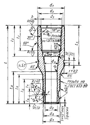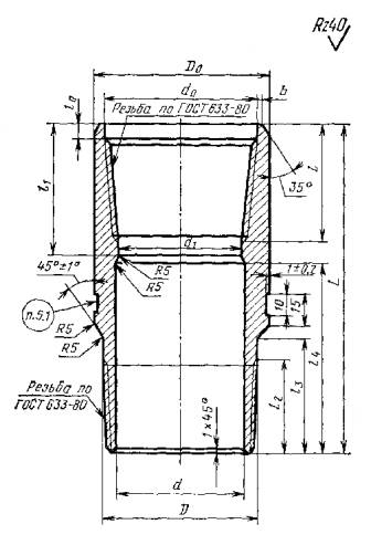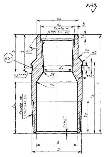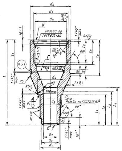 * Графы А, Б, В, Г (Исключены, Изм. № 1) Примечание. Размеры резьбы труб и переводников выбираются по ГОСТ 633-80 для труб – по условному диаметру и типу, для переводников – по его условному обозначению. (Введено дополнительно, Изм. № 1) Пример условного обозначения переводника типа М условным диаметром 73 мм на муфтовом конце и 48 мм на ниппельном конце из стали группы прочности Е: Переводник П73´48-Е ГОСТ 23979-80 То же, с высаженными наружу концами группы прочности Л: Переводник ПВ 73´В48-Л ГОСТ 23979-80 То же, типа Г: Переводник ПГ73´48-Л ГОСТ 23979-80 То же, типа Б: Переводник ПБ73´48-Л ГОСТ 23979-80 2. ТЕХНИЧЕСКИЕ ТРЕБОВАНИЯ2.1. Переводники для насосно-компрессорных труб должны изготовляться в соответствии с требованиями настоящего стандарта по рабочим чертежам, утвержденным в установленном порядке. 2.2. Переводники для насосно-компрессорных труб должны изготовляться из сталей, обеспечивающих механические свойства переводников в соответствии с группами прочности материала труб по ГОСТ 633-80. 2.3. На наружной и внутренней поверхностях переводников не должно быть трещин, плен, раковин, закатов, подрезов, расслоений, песочин и глубоких рисок. Заварка, зачеканка или заделка дефектных мест не допускается. 2.4. Резьбы переводников должны выполняться в соответствии с требованиями ГОСТ 633-80. 2.5. Оси резьбы обоих концов переводника должны быть соосны. Отклонение от соосности не должно превышать 0,75 мм в плоскости торца. 2.6. Резьбы обоих концов переводника для предохранения от заедания должны быть фосфатированы. Требования по гальванопокрытию по ГОСТ 9.301-78. 2.7. Предельные отклонения размеров переводников должны соответствовать указанным в табл. 6. 2.8. Наружная поверхность переводников, кроме резьбы, должна быть окрашена влагостойкой краской по ГОСТ 10503-71. Качество лакокрасочного покрытия - VI класс по ГОСТ 9.032-74. 2.9. Срок службы переводников до списания - не менее 6 лет. 2.10. Торцы ниппельных концов и упорные уступы муфтовой части переводников типа ПГ, а также упорные поверхности А, Б, В, и Г переводников типа ПБ должны изготовляться в соответствии с требованиями ГОСТ 633-80. (Введен дополнительно, Изм. № 1) Размеры в мм