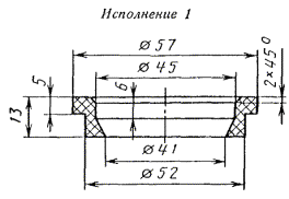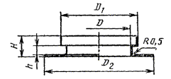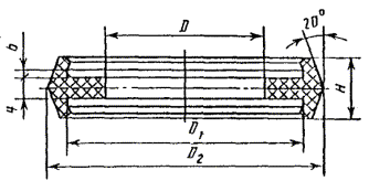 Примечание. Исполнение 1 - прокладка из пищевой резины; Исполнение 2 - прокладка из кислотощелочестойкой резины. Пример условного обозначения муфтообразной прокладки исполнения 1 - для трубы Dу = 15 мм: Прокладка М-обр. 1-15 ГОСТ 24188-80 То же, исполнения 2: Прокладка М-обр. 2-15 ГОСТ 24188-80 4в. Конструкция и основные размеры составной прокладки должны соответствовать указанным на черт. 6 и в табл. 6. Таблица 6 Размеры в мм
