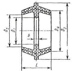 Пример условного обозначения Г-образной прокладки для трубы Dн = 45 мм из пищевой резины: Прокладка Г 45-П ГОСТ 24188-80 То же, из кислотощелочестойкой: Прокладка Г 45-К ГОСТ 24188-80 То же, из теплостойкой: Прокладка Г 45-Т ГОСТ 24188-80 4б. Конструкция и основные размеры муфтообразной прокладки должны соответствовать указанным на черт. 5 и в табл. 5. Таблица 5 Размеры в мм
