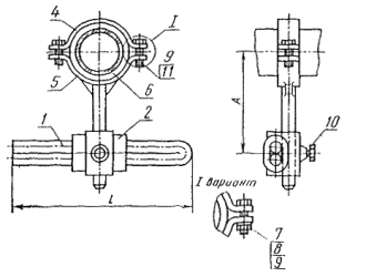 Дата введения 01.07.81 (Измененная редакция, Изм. № 2). 1. Настоящий стандарт распространяется на регулируемые кронштейны, применяемые для крепления стеклянных трубопроводов. Требования настоящего стандарта являются обязательными. (Измененная редакция, Изм. № 2). 2. Конструкция и основные размеры регулируемых кронштейнов должны соответствовать указанным на черт. 1 и в табл. 1. Исполнение 1 Исполнение 2 1 - стержень; 2 - ползунок; 3 - скоба; 4 - хомут; 5 - хомут с хвостовиком; 6 - прокладка по ГОСТ 24192-80; 7 - болт М6´30.36.016 по ГОСТ 7798-70; 8 - гайка M6.4.0.16 по ГОСТ 5915-70; 9 - шайба 6.36.01 по ГОСТ 11371-78; 10 - болт М8´16.36.016 по ГОСТ 7798-70; 11 - болт M6´25.36.016 по ГОСТ 7798-70 Таблица 1 Размеры в мм