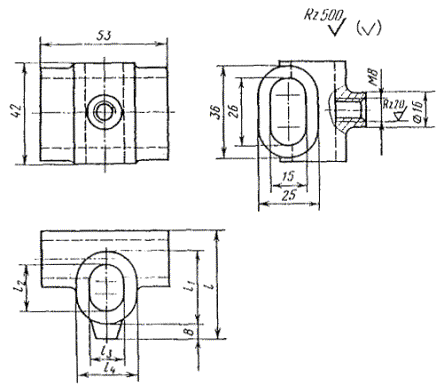 (Измененная редакция, Изм. № 2). Пример условного обозначения стержня длиной l = 350 мм из стали марки Ст3кп: Стержень 350 ГОСТ 24199-80 То же, из стали марки Ст3сп: Стержень 350-С ГОСТ 24199-80 4. Конструкция и основные размеры ползунка и скобы должны соответствовать указанным на черт. 3 и в табл. 3. Ползунок Скоба * Размер для справок. Таблица 3 Размеры в мм