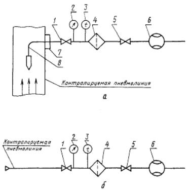 где d - внутренний диаметр заборной трубки, мм; vЗ.Т - скорость воздуха в заборной трубке, м/с; рЗ.Т - абсолютное давление в заборной трубке, определенное по манометру 2 (см. черт. 1а), МПа; TЗ.Т - температура воздуха в заборной трубке, К. 2.6. Измерение содержания твердых частиц с помощью аэрозольного счетчика производят путем пропускания проб воздуха через счетчик и определения числа и размеров твердых частиц. а - изокинетический отбор пробы воздуха; б - пропускание через контрольный фильтр всего потока воздуха; 1 - кран; 2 - манометр; 3 - термометр; 4 - фильтр; 5 - кран; 6 - расходомер; 7 - штуцер для ввода заборной трубки; 8 - заборная трубка с наконечником Черт. 1 Концентрацию твердых частиц С, в мг/м3 определяют по формуле