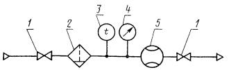 1 - край; 2 - тарированный фильтр-влагоотделитель; 3 - термометр; 4 - манометр; 5 - расходомер Черт. 2 4.2. Перед определением содержания воды и масла в жидком состоянии необходимо убедиться в их наличии, для чего струю воздуха непосредственно из трубопровода направляют на лист чистой фильтровальной бумаги. Расстояние от конца трубки до листа бумаги устанавливают от 50 до 100 мм в зависимости от давления сжатого воздуха. Появление на бумаге в течение 5 мин пятен свидетельствует о наличии воды и масла в жидком состоянии. 4.3. Расход воздуха через тарированный фильтр-влагоотделитель должен соответствовать номинальному режиму пневматической системы и расходной характеристике тарированного фильтра-влагоотделителя. 4.4. Испытание должно продолжаться до появления в резервуаре фильтра-влагоотделителя 0,1-0,2 дм3 смеси воды и масла, после чего производят их разделение и взвешивание. 4.5. Содержание воды в жидком состоянии СВ в мг/м3 определяют по формуле