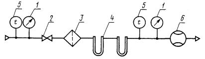где тМ - масса масла, мг; hМ - эффективность тарированного влагоотделителя для масла. 5. ИЗМЕРЕНИЕ СОДЕРЖАНИЯ ВОДЯНЫХ ПАРОВ5.1. Содержание водяных паров (температуру точки росы) следует определять при помощи приборов для измерения влажности или весовым методом. 5.2. Содержание водяных паров (температуру точки росы) весовым методом должно определяться путем пропускания пробы воздуха через U-образные трубки, снаряженные силикагелем-индикатором, с расходом 0,025 дм3/с в течение 2 ч. Изменение цвета силикагеля в последней U-образной трубке не допускается. Схема установки должна соответствовать черт. 3. 1 - манометр; 2 - кран; 3 - фильтр, обеспечивающий очистку воздуха до размеров частиц, соответствующих классу 0 по ГОСТ 17433-80; 4 - трубки, снаряженные силикагелем-индикатором; 5 - термометр; 6 - расходомер Черт. 3 5.3. Содержание водяных паров СВ.П в мг/кг определяют по формуле