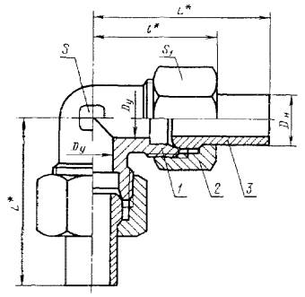 Срок действия с 01.01.1982 до 01.01.2000 1. Настоящий стандарт распространяется на угловые проходные соединения трубопроводов с шаровым ниппелем с углом конуса угольника 24°. 2. Конструкция и основные размеры соединений трубопроводов должны соответствовать указанным на чертеже и в таблице. *Размеры для справок 1 - угольник по ГОСТ 21859-78; 2 - накидная гайка по ГОСТ 23353-78; 3 - шаровой ниппель по ГОСТ 23355-78 Размеры, мм