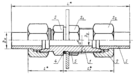 Срок действия с 01.01.1982 до 01.01.2000 1. Настоящий стандарт распространяется на переборочные соединения трубопроводов с шаровым ниппелем разборные (исполнение 1) и приварные (исполнение 2) с углом конуса штуцера 24°. 2. Конструкция и основные размеры соединений трубопроводов должны соответствовать указанным на чертеже и в таблице. Исполнение 1 Исполнение 2 _______________ * Размеры для справок. 1 - штуцер по ГОСТ 21872-78; 2 - накидная гайка по ГОСТ 23353-78; 3 - шаровой ниппель по ГОСТ 23355-78; 4 - прокладка по ГОСТ 23358-87, 5 - контргайка по ГОСТ 15803-76 Размеры, мм
