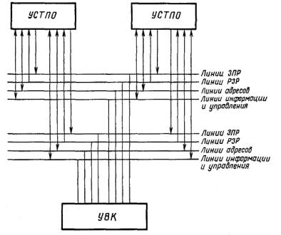 Дата введения 01.07.83 Настоящий стандарт распространяется на магистральный стык между управляющим вычислительным комплексом (УВК) и устройствами сопряжения телефонного периферийного оборудования (УСТПО) автоматических телефонных станций (АТС) с централизованным и иерархическим управлением. (Измененная редакция, Изм. № 1). 1. ОБЩИЕ ПОЛОЖЕНИЯ1.1. Стык УВК с УСТПО осуществляют на базе двух или более независимых магистралей передачи информации, состоящих из функциональных линий взаимодействия. Структура подключения УСТПО к УВК на базе двух магистралей показана на черт. 1. 1.2. Процедуру взаимодействия УСТНО с УВК в системе строят таким образом, что в любой момент времени в обмене информацией по магистрали участвуют только два устройства, связанные между собой как ведущее (управляющее обменом) устройство и ведомое (управляемое) устройство. Ведущим и ведомым устройствами могут быть УВК и УСТПО. Магистраль используется УВК и всеми УСТПО в режиме разделения времени в соответствии с принятой системой приоритетов устройств. Последовательность занятия магистрали в текущий момент и выбор ведущего устройства на магистрали устанавливает УВК. 1.3. Связь УВК с УСТПО по магистрали асинхронна и определяется последовательностью управляющих сигналов. 1.4. Все линий магистрали по способу передачи сигналов делят на два типа: - к первому типу относят линии магистрали, используемые для двухсторонней передачи сигналов. К этим линиям все УСТПО подключают параллельно. Этим линиям в физической реализации магистрали соответствует один контакт, к которому подключены как вход, так и выход соответствующих магистральных элементов; - ко второму типу относят линии, сигналы на которых проходят последовательно через все устройства, подключенные к магистрали. Каждой из этих линий в физической реализации соответствуют два контакта, обозначенные для принимаемого сигнала буквой R, представляемой после названия сигнала (PЗPR, ЗПРК), и Т - для передаваемого сигнала (РЗРТ). 2. ТРЕБОВАНИЯ К ФУНКЦИОНАЛЬНО-ВРЕМЕННЫМ ХАРАКТЕРИСТИКАМ МАГИСТРАЛИ СТЫКА2.1. Состав и физическая реализация линий магистрали 2.1.1. Магистраль передачи информации состоит из 86 функциональных линий, в том числе: 66 линий обмена данными; 19 линий для выбора ведущего устройства; одной служебной линии. Наименование линий магистрали, их условное обозначение, структурные характеристики (источника и приемника сигналов, направленность линий, уровень логической «1» сигнала) приведены в табл. 1. Таблица 1
