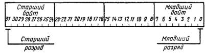 2.1.3. Вторая (основная) группа линий магистрали (78 линий) характеризуется представлением логической «1» низким уровнем напряжения. Линии первой группы характеризуются представлением логической «1» высоким уровнем напряжения. Все линии первой и второй групп должны быть организованы по схеме с параллельным согласованием. В начале и конце каждой линии включаются согласующие резисторы. Линии второй группы не всегда должны проходить от одного физического конца магистрали до другого. Любая из линий этой группы может прерываться на каждом УСТПО, находящемся на данном уровне приоритета на магистрали, или продолжаться далее, если данное устройство не является источником запроса. 2.1.4. Организация приема - передачи двунаправленного сигнала показана на черт. 2. (Т) - передаваемый сигнал; (R) - принимаемый сигнал Параметры магистральных усилителей должны обеспечивать возможность подключения к УВК не менее 20 УСТПО, удаленных на расстояние до 30 м от УВК. При передаче сигналов по линиям магистрали на расстояние более 30 м и подключении более 20 УСТПО допускается использовать ретрансляторы магистрали. 2.2. Назначение линий 2.2.1. Линии «Адрес» А (19-00) используются ведущим устройством для выбора ведомого в процессе передачи данных по магистрали. Линии А (19-00) могут использоваться всеми устройствами на магистрали для обращения к ячейкам памяти и регистрам УСТПО, а также ячейкам памяти УВК. Устройство, реагирующее на выставленный адрес, является ведомым в данной операции обмена. Формат адресного слова, передаваемого по линиям А (19-00), показан на черт. 3. Старший разряд адреса передается по линии А (19), младший - по линии А (00). Допускается уменьшение числа линий А (19-00) до 8. При этом не используются линии со старшими номерами. 2.2.2. Линии «Данные» Д (31-00) используются для передачи информации между устройствами, подключенными к магистрали. Передаваемое по линиям Д (31-00) слово содержит четыре 8-разрядных байта информации. Младший байт передается по линиям Д (07-00), старший байт - по Д (31-24). Допускается уменьшение числа используемых линий Д (31-00) до 8. При этом не используются линии со старшими номерами. Формат данных, передаваемых по линиям Д (31-00), показан на черт. 4. Черт. 4 Таблица 3