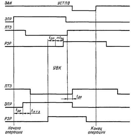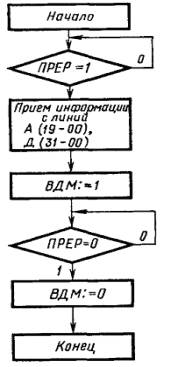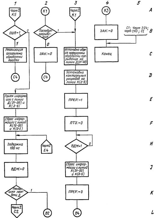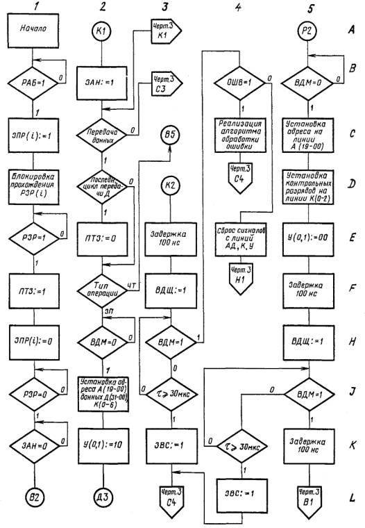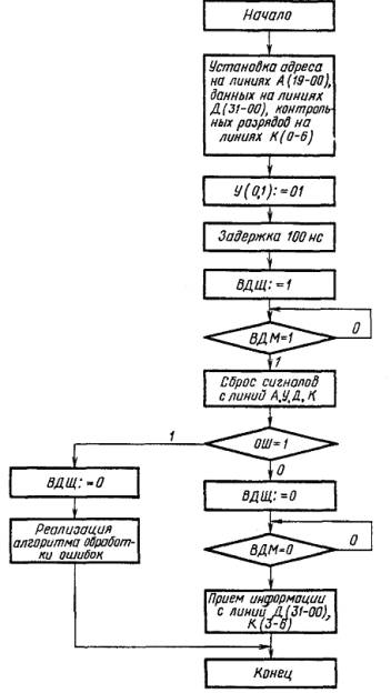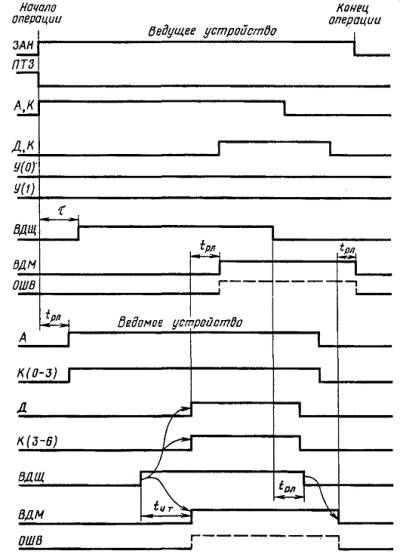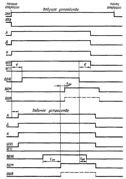 2.2.3. Линии «Управление» У (0, 1) используются ведущим устройством для передачи ведомому кода операции, которую оно должно выполнить. В табл. 3 приведены коды операций обмена, передаваемые по линиям У (0, 1). 2.2.4. Линия «Сопровождение от ведущего» (ВДЩ) используется для передачи сигнала синхронизации от ведущего устройства ведомому. Сигнал на линии ВДЩ указывает ведомому устройству, определяемому адресом, установленным на линиях А (19-00), на необходимость выполнения операции, определяемой кодом на линиях У (0, 1). Сброс сигнала на линии ВДЩ информирует ведомое устройство о том, что ведущее устройство считает операцию передачи данных завершенной. 2.2.5. Линия «Сопровождение от ведомого» (ВДМ) используется для передачи сигнала синхронизации от ведомого устройства к ведущему. Сигнал на линии ВДМ указывает ведущему устройству о завершении ведомым своей части операции обмена. Сброс сигнала на линии ВДМ указывает на то, что ведомое устройство зафиксировало сброс сигнала на линии ВДЩ. При выполнении операции «Прерывание» сброс сигнала ВДМ указывает на то, что сброс сигнала ПРЕР был воспринят УВК. 2.2.6. Линия «Прерывание» (ПРЕР) функционально аналогична линии ВДЩ. Сигнал на линии ПРЕР устанавливается УСТПО после того, как оно стало ведущим на магистрали. Сигнал ПРЕР информирует УВК о необходимости произвести прерывание выполнения программы. 2.2.7. Линии «Контроль» К (0-6) предназначены для передачи контрольных разрядов (дополнение до нечетности) для информации, передаваемой по линиям А (19-00), Д (31-00), У (0, 1). По линии К0 передается контрольный разряд для информации, передаваемой по линиям А (19-16) и У (0, 1). По линии К1 передается контрольный разряд для информации, передаваемой по линиям А (15-08). По линии К2 передается контрольный разряд для информации, передаваемой по линиям А (07-00). По линии КЗ передается контрольный разряд для информации, передаваемой по линиям Д (31-24). По линии К4 передается контрольный разряд для информации, передаваемой по линиям Д (23-16). По линии К5 передается контрольный разряд для информации, передаваемой по линиям Д (15-08). По линии К6 передается контрольный разряд для информации, передаваемой по линиям Д (07-00). 2.2.8. Линия «Ошибка ведомого» (ОШВ) используется ведомым устройством для передачи сигнала об ошибке, обнаруженной ведомым устройством в процессе выполнения операции обмена. 2.2.9. Линия «Зависание» (ЗВС) используется ведущим устройством для информирования всех устройств, подключенных к магистрали, о том, что отсутствует сигнал ВДМ в течение 30 мкс после выдачи сигнала ВДЩ. 2.2.10. Линии «Запрос магистрали» ЗПР (0-7) используются активными УСТНО при выполнении операции «Захват магистрали». Каждой линии ЗПР присвоен уровень приоритета, причем сигнал, передаваемый по линии ЗПР7, имеет наивысший приоритет, а ЗПРО - низший. Если к одной и той же линии ЗПР подключено более одного периферийного устройства, то устройство, расположенное в электрической цепи ближе к УВК, имеет более высокий приоритет, чем находящийся дальше от него. 2.2.11. Линии «Разрешение» РЗР (0-7) используются УВК для передачи сигналов РЗР (0-7) в ответ на соответствующие сигналы ЗПР (т.е. РЗР7 является ответом на ЗПР7, РЗР6 - ответом на ЗПР6 и т.д.). 2.2.12. Линия «Подтверждение запроса» (ПТЗ) используется УСТПО, выставившим сигнал ЗПР, для информирования УВК о получении сигнала РЗР. УСТПО, устано