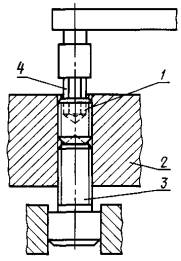 Для испытания на кручение установочный винт 1 ввинчивают в резьбовое отверстие (допуск резьбы - 5Н) контрольной плиты 2 до упора в винт 3, ввинченный с другой стороны плиты, при этом верхняя поверхность испытуемого винта должна быть утоплена в контрольной плите. Твердость контрольной плиты - не менее HRСэ 50, твердость винта 3 - HV450...570. Для приложения к испытуемому винту крутящего момента используется шестигранная вставка 4, имеющая допуск на размер S под ключ h9, диаметр описанной окружности e ≥ 1,13Smin и твердость HRСэ 55...60. Вставка должна входить в шестигранное углубление испытуемого винта на полную его глубину. Винты должны выдерживать крутящий момент, величины которого указаны в табл. 5. Размеры мм