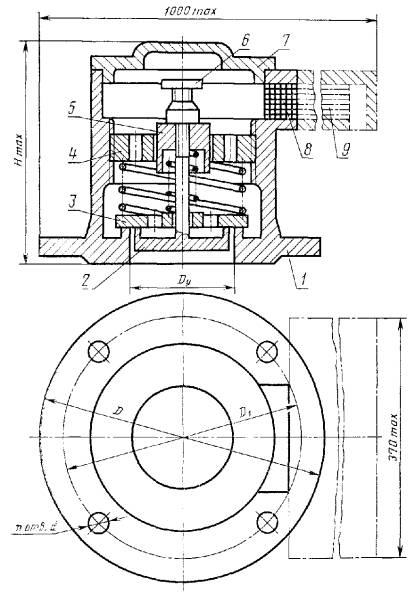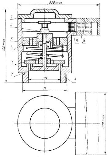 * При новом проектировании не применять. Примечание. Знак « + » означает, что диаметр d следует применять при данном диаметре D1. Для дыхательных устройств типоразмеров 032 и 200 (см. табл. 2) в технически обоснованных случаях допускаются конструктивные исполнения с иными присоединительными размерами. Пример условного обозначения дыхательного устройства типа УД1, типоразмеров 125 и 080 (первый из которых регламентирует выпуск, а второй - впуск рабочей среды) с диаметром условного прохода Dу 50 мм: УД1-125.080-50 ГОСТ 25560-82 То же, типоразмеров 080 (одинаковых для выпуска и впуска рабочей среды), с диаметром условного прохода Dу 50 мм: УД1-080.080-50 ГОСТ 25560-82 То же, типоразмера 080 (регламентирующего только впуск рабочей среды), с диаметром условного прохода Dу 50 мм: УД1-000.080-50 ГОСТ 25560-82 Дыхательное устройство типа УД1 1 - корпус; 2 - тарель впускного затвора; 3 - тарель выпускного затвора; 4, 5 - регулировочные гайки; 6 - рукоятка; 7 - крышка корпуса; 8 - огневой предохранитель; 9 - пылеулавливающий фильтр Дыхательное устройство типа УД2 1 - корпус; 2 - тарель впускного затвора; 3 - тарель выпускного затвора; 4, 5 - регулировочные гайки; 6 - рукоятка; 7 - крышка корпуса; 8 - огневой предохранитель; 9 - пылеулавливающий фильтр Примечание. Черт. 1 и 2 не определяют конструкции дыхательных устройств. 2. ТЕХНИЧЕСКИЕ ТРЕБОВАНИЯ2.1. Дыхательные устройства следует изготовлять в соответствии с требованиями настоящего стандарта по рабочим чертежам. 2.2. Требования к конструкции 2.2.1. Дыхательные устройства должны работать автоматически (без участия обслуживающего персонала). 2.2.2. Конструкцией дыхательных устройств должны быть обеспечены: требуемая герметичность в затворах при давлении Pг; начало открывания затворов в заданных интервалах рабочего давления Pр; возможность настройки затворов на заданное давление начала открывания (при необходимости); достижение пропускной способности при полном открывании затворов при давлениях не более Pо; устойчивая работа затворов в открытом положении; закрытие затворов при избыточном давлении (разрежении), составляющем не менее 80 % минимального значения Pр; защита от попадания атмосферных осадков на затворы и внутрь цистерны; работоспособность при знакопеременных колебаниях температур. 2.2.3. Утечка рабочей среды через закрытые затворы при давлении Pг и нормальной температуре рабочей и окружающей среды (298 ± 10) К ((25 ± 10) °С) не должна превышать значений, указанных в табл. 4.