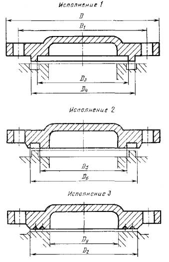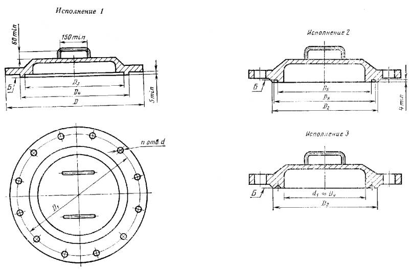* При новом проектировании крышек не применять. ПРИЛОЖЕНИЕ 1СправочноеПОЯСНЕНИЯ ТЕРМИНОВ, ПРИМЕНЯЕМЫХ В СТАНДАРТЕКрышка люка откидная (КО) - крышка люка, устанавливаемая на петлях, поворотном рычаге или другом шарнирном устройстве. Крышка люка съемная (КС) - крышка люка, которую крепят к люку (фланцу люка) болтами или шпильками и т.п. Люк цистерны - отверстие в корпусе цистерны, используемое для налива (горловина), в качестве лаза, для размещения в нем или на его крышке специального оборудования цистерны и других целей. Диаметр условного прохода люка Dу - номинальный внутренний диаметр отверстия люка. Светлые нефтепродукты - жидкости, получаемые при переработке нефти и нефтепродуктов и используемые в качестве жидкого топлива в системах питания двигателей, в том числе: поршневых двигателей с искровым зажиганием, авиационных газотурбинных двигателей, дизелей и газотурбинных двигателей наземных и морских транспортных средств, а также для коммунально-бытовых (керосин осветительный) и других целей. ПРИЛОЖЕНИЕ 2РекомендуемоеКОНСТРУКЦИЯ И ОСНОВНЫЕ РАЗМЕРЫ ОТКИДНЫХ КРЫШЕК1. Конструкция и основные размеры откидных крышек массивной конструкции (литых, точеных, штампованных, из неметаллических материалов) приведены на черт. 1 и в табл. 1. мм
