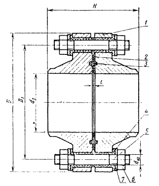 (Измененная редакция, Изм. № 1). Постановлением Государственного комитета СССР по стандартам от 3 марта 1983 г. № 1065 срок действия установлен с 01.07.84 Несоблюдение стандарта преследуется по закону 1. Настоящий стандарт распространяется на стальные приварные встык фланцы под прокладки и втулки из электроизоляционного материала. Фланцы в сборе используют для электрохимической (катодной) защиты от коррозии подводных и подземных (наземных) трубопроводов на условное давление Ру 10,0 МПа (≈100 кгс/см2) и температуру среды не выше 353 К (80 °С). (Измененная редакция, Изм. № 1). 2. Конструкция и размеры фланцев, изолирующих прокладок и втулок должны соответствовать указанным на черт. 1-5 и в табл. 1-5. Изолирующие фланцы 1 - фланец; 2 - изолирующее покрытие, полученное напылением; 3 - изолирующая уплотнительная прокладка; 4 - изолирующая втулка; 5 - шпилька по ГОСТ 22042-76; 6 - гайка по ГОСТ 5915-70; 7 - шайба по ГОСТ 10450-78 (Измененная редакция, Изм. № 1). Размеры в мм