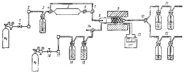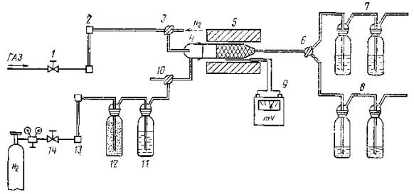 2.1.6. В контейнеры под давлением пробы газа отбирают без очистки от сероводорода. Очистку производят перед анализом, как указано в п. 2.1.2. 2.2. Аппаратура, материалы и реактивы Аппаратура, применяемая для определения общей серы (п. 1.2). Трубка соединительная стеклянная (тройник) по ГОСТ 23932-79. Зажим винтовой. Склянки для промывания газа СН-1 - 100, СН-1 - 500, СН-1 - 200 по ГОСТ 25336-82. Счетчик газовый барабанный типа ГСБ-400. Кадмий хлористый по ГОСТ 4330-76, 30 %-ный водный раствор. 2.3. Подготовка к испытанию 2.3.1. Для фотоколориметрического определения сероводорода строят градуировочный график по п. 1.3.1. 2.3.2. Собирают установку для гидрирования (черт. 2). Установку собирают встык стеклянными трубками на резиновых соединениях, подготовленных как указано в п. 1.3.2. Склянки 12 заполняют 30 см3 2 %-ного раствора ацетата цинка. Склянки 11, 15 заполняют наполовину дистиллированной водой. Устанавливают кварцевую трубку с катализатором в печь как указано в п. 1.3.2. 2.3.3. Газовую пипетку с пробой газа в течение 30 мин выдерживают в помещении, где проводят испытание, и затем поворотом крана давление газа в пипетке приводят к атмосферному и подключают пипетку к установке (см. черт. 2). 2.3.4. Пробу газа, предварительно отобранную в контейнер, переводят в газовую пипетку известной вместимости вытеснением запирающей жидкости с последующей продувкой ее 4 - 5-кратным объемом испытуемого газа, предварительно очищенного от сероводорода в склянках, помещенных перед пипеткой, по п. 2.1.2. Готовят газовую пипетку, как указано в п. 2.3.3. 2.3.5. Установку продувают азотом. Первоначально при закрытых кранах 6, 10, регулируя вентилем 1, продувают линию азотом через краны 4, 7, 14 в атмосферу. Продувку проводят в течение 3 - 5 мин со скоростью 5 дм3/ч, установленной по реометру 2. Затем при закрытом кране 14 продувают азотом в течение 10 мин остальную часть установки с помощью крана 10, переключая его вначале на склянки 12, а затем - склянки 11. Линию подачи водорода через кран 14 продувают водородом в атмосферу в течение 3 - 5 мин. После чего поток водорода направляют в кварцевую трубку 8 и склянки 11 со скоростью 20 дм3/ч, установленной по реометру 17. Стабилизируют поток азота со скоростью 5 дм3/ч. Включают нагрев печи. 1, 18 - игольчатые вентили; 2, 17 - реометры; 3, 16 - склянки с активированным углем; 4, 7, 10, 14 - трехходовые краны; 5 - газовая пипетка; 6 - одноходовой кран; 8 - трубка кварцевая; 9 - электрическая печь; 11 - склянки с дистиллированной водой; 12 - склянки с поглотительным раствором; 13 - милливольтметр; 15 - склянка-увлажнитель водорода Черт. 2 2.4. Проведение испытания 2.4.1. После достижения заданной температуры (950 ± 10) °С переключением крана 10 поток газов направляют в поглотительные склянки 12 с раствором ацетата цинка. Открывают кран 6 пипетки 5 с пробой газа, переключают краны 4, 7 и азотом вытесняют пробу из пипетки в кварцевую трубку 8 для гидрирования. Вытеснение пробы газа азотом проводят не менее 1 ч. После окончания испытания поток газов направляют в склянки 11 с дистиллированной водой. Записывают температуру и барометрическое давление. Склянки 12 с раствором ацетата цинка отсоединяют от установки и далее определяют как указано в п. 1.4.3. Отключают печь, подачу водорода, а затем через 10 мин - подачу азота и отсоединяют склянки 11 от установки. 2.4.2. Подготовку установки к анализу новой пробы производят как указано в пп. 1.4.4, 1.4.5. 2.5. Обработка резуль