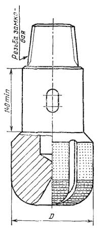 *До 01.01.89 - для долот, оснащенных сверхтвердыми композиционными материалами. Пример условного обозначения долота наружным диаметром D = 214,3 мм для бурения пород средней твердости Долото 214,3 С ГОСТ 26474-85 4. Основные размеры бурильных головок с несъемным керноприемником должны соответствовать приведенным на черт. 2 и табл. 3. Размеры в мм