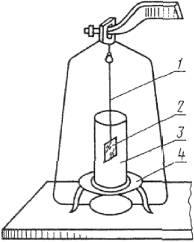 1 - проволока; 2 - образец; 3 - стакан; 4 - подставка термометр стеклянный лабораторный с диапазоном измерения от 0 до 105 °С, ценой деления 0,5 °С, погрешностью измерения ±0,5 °С по ГОСТ 28498; стакан стеклянный вместимостью 250 см3 по ГОСТ 25336; подложка сетчатая из нержавеющей стали, подставка для стакана (см. чертеж); проволока из нержавеющей стали диаметром от 0,7 до 1,5 мм с острым концом либо крючком на конце по ГОСТ 5468 или по другой нормативно-технической документации; дополнительный груз плотностью не менее 7 × 103 кг/м3 (7 г/см3) правильной геометрической формы и с гладкой поверхностью для испытания образцов, плотность которых ниже плотности испытательной жидкости; спирт этиловый технический по ГОСТ 18300 или по ГОСТ 17299; вода дистиллированная по ГОСТ 6709; секундомер, 3-го класса точности; линейка длиной 150 мм по ГОСТ 427; пинцет из нержавеющей стали. Допускается применять другие средства измерения с соответствующими диапазонами измерений и погрешностями не более указанных. 2.1.2. Проведение испытаний Образцы взвешивают в воздухе, накалывают на проволоку и подвешивают на коромысло весов. На столик весов помещают подставку, на которую ставят стакан со свежепрокипяченной дистиллированной водой, охлажденной до температуры (23 ± 2) °С или (27 ± 2) °С. Образец погружают в воду, не касаясь стенок и дна стакана, таким образом, чтобы при уравновешивании он находился ниже уровня воды не менее чем на 10 мм, и взвешивают. Образец вынимают из воды и снимают с проволоки. Проволоку вновь погружают в воду на такую же глубину, как и при взвешивании с образцом, и взвешивают. При испытании хрупких резин и эбонита образец помещают на сетчатую подложку, которую подвешивают на коромысло весов с помощью проволоки с крючком. Если на поверхности образца образуются пузырьки воздуха, образец вынимают из стакана с дистиллированной водой и погружают на 2 - 3 с в другую жидкость с незначительным содержанием смачивающего вещества, например, этилового спирта. Затем на такое же время погружают в отдельный сосуд с испытательной жидкостью, после чего проводят взвешивание. Примечание. При испытании образцов плотностью ниже чем 1 г/см3 (1 Мг/м3) рекомендуется применять этиловый спирт вместо дистиллированной воды либо на проволоку подвешивать дополнительный груз, массу которого следует при расчете прибавлять к измеренным массам. 2.1.3. Обработка результатов Плотность образца (ρ) в г/см3 (Мг/м3) вычисляют по формуле