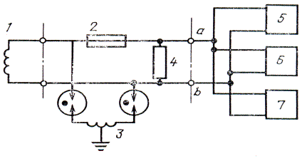1 - преобразователь тока; 2 - предохранитель; 3 – двухэлектродный разрядник с дренажной катушкой; 4 - измерительный резистор; 5 - селективный вольтметр (анализатор гармоник); 6 - вольтметр для измерения эффективных значений; 7 - псофометр 2.4.3. Проведение измерения Измерения следует проводить по п. 2.3.3. 2.4.4. Обработка результатов Обработка результатов - по п. 2.3.4. 2.5. Непосредственное измерение гармонических составляющих тока в нейтрали 2.5.1. Общие положения Общие положения - по п. 2.3.1. Непосредственное измерение следует проводить на трансформаторной подстанции. 2.5.2. Аппаратура Измерение абсолютных значений гармонических составляющих тока в нейтрали необходимо проводить по схеме, приведенной на черт. 5, а измерение относительных значений - по схеме, приведенной на черт. 6. 2.5.3. Проведение измерения Измерения следует проводить по п. 2.3.3. 2.5.4. Обработка результатов Обработка результатов - по п. 2.3.4.