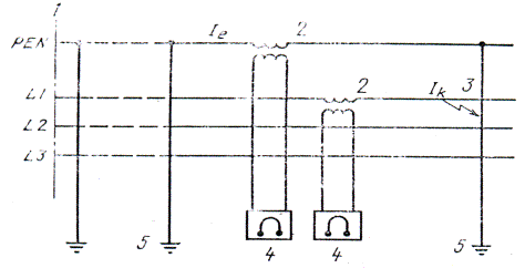 1 - питающая сторона линии трехфазного тока; 2 - преобразователь тока в тросе заземления и в одном проводе системы трехфазного переменного тока; 3 - место короткого замыкания на землю; 4 - шлейфовые осциллографы; 5 - заземляющее устройство; PEN - трос заземления; L1, L2, L3 - провода системы трехфазного переменного тока Коэффициент защитного действия троса заземления линии трехфазного тока (rе) следует определять по формуле