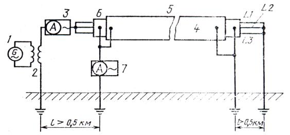 1 - воздушная линия высокого напряжения в сети с глухим заземлением нейтрали; 2 - кабель связи; 3 - броня; 4 - оболочка; 5 - жила; 6 - осциллограф; 7 - место короткого замыкания на землю; 8 - выключатель; L1, L2, L3 - провода системы трехфазного переменного тока; А, В, С, D - кольцевые электроды, припаянные к оболочке и к броне; l1 - участок между питающим трансформатором и измеряемым кабелем; l2 - длина измерительного участка; l3 - участок между местом измерения и местом короткого замыкания на землю