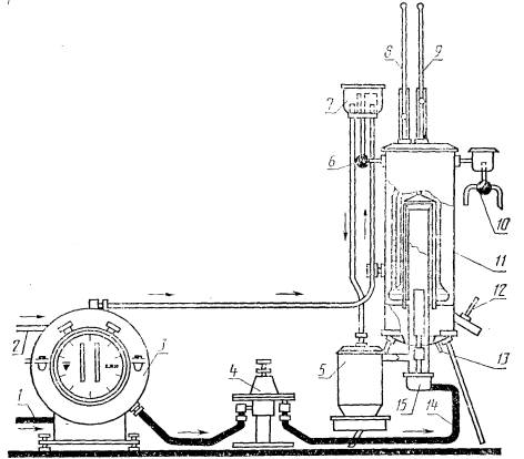 Постановлением Государственного комитета СССР по стандартам от 26 декабря 1986 г. № 4544 срок действия установлен с 01.01.88 до 01.01.93 Несоблюдение стандарта преследуется по закону Настоящий стандарт устанавливает метод определения водяным калориметром высшей (Qв) и низшей (Qн) теплоты сгорания. 1. СУЩНОСТЬ МЕТОДАОпределение теплоты сгорания заключается в непрерывном сжигании в калориметре измеренного объема газа и измерении выделившегося тепла, поглощаемого непрерывно протекающим потоком воды. На основе измеренных данных вычисляют высшую теплоту сгорания (Qв) природного газа. Для определения низшей теплоты сгорания (Qн) измеряют объем конденсата водяного пара, получаемого при сгорании газа. На основе этого вычисляют теплоту конденсации. Стандарт полностью соответствует СТ СЭВ 3360-81. 2. ОТБОР ПРОБПробы природного газа отбирают из пробоотборной линии, соединяющей калориметр с газопроводом, или из пробоотборника в соответствии с ГОСТ 18917-82. 3. АППАРАТУРА И МАТЕРИАЛЫЛабораторный водяной калориметр (чертеж), включающий: теплообменник с увлажнителем воздуха; 1 - газоподвод; 2 - водоподвод; 3 - газовый счетчик; 4 - мембранный регулятор давления высокой чувствительности; 5 - увлажнитель воздуха; 6 - вентиль для регулирования воды; 7 - переливной бак для воды; 8, 9 - термометр для измерения температуры воды на выходе; 10 - трехходовой кран для нагретой воды; 11 - теплообменник; 12 - термометр для измерения температуры отходящих газов; 13 - выпускной патрубок конденсата; 14 - шланг газовой горелки; 15 - газовая горелка. водяной газовый счетчик с погрешностью измерения не более 1 %; предварительный мембранный регулятор для газового давления свыше 0,80 кПа; мембранный регулятор давления высокой чувствительности; горелку с головкой для нормального или высококалорийного газа; комплект сопел горелок диаметром от 1,6 до 2,4 мм в соответствии с табл. 1; Таблица 1