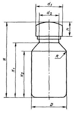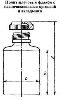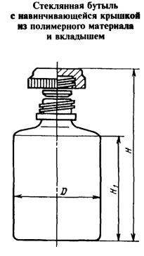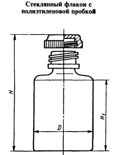 Черт. 8а склянки 3-5, 3т-5 по ГОСТ 3885 вместимостью 50; 100; 250; 500 см3; флаконы 4-2, 4т-2 по ГОСТ 3885 вместимостью 50; 100 см3; флаконы из стекла ХС1 или ТХС1 по ГОСТ 21400 с полиэтиленовой пробкой (черт. 9); флаконы из полиэтилена по ГОСТ 16338-85 с навинчивающейся крышкой и вкладышем (черт. 10); бутыли из стекла ХС1 или ТХС1 по ГОСТ 21400 с навинчивающейся крышкой (черт. 11); бутыли 8-1 и 8-5 по ГОСТ 3885 вместимостью от 2 до 25 дм3; канистры 9-1 по ГОСТ 3885 вместимостью 5000; 10000 см3; баллоны из коррозионно-стойкой стали 12Х18Н10Т по ГОСТ 5632 (черт. 12). (Измененная редакция, Изм. № 1). 3.5. Газообразную продукцию упаковывают в: ампулы по ГОСТ 23644; запаянные ампулы с разбивающимся вентилем вместимостью до 1100 см3 из стекла ХС1 или ТХС1 по ГОСТ 21400 (черт. 13, 14); баллоны по ГОСТ 949 вместимостью от 0,4 до 8 дм3 на давление 9,8×106; 14,7·106; 19,6·106 Па из легированной или углеродистой стали; 3.6. Массу продукции определяют с погрешностью по ГОСТ 3885. 3.7. Тара из стекла не должна иметь видимых невооруженным глазом инородных включений, трещин, воздушных пузырьков, сколов. 3.8. Потребительская тара, воронки, шпатели и т.д., применяемые для фасовки продукции, должны быть чистыми и сухими. При фасовке твердой продукции потребительская тара должна быть заполнена не более 95 % объема, для жидкой - необходимо оставлять свободное пространство (недолив), при котором жидкость не будет полностью заполнять емкость при температуре 55 °С. Размеры, мм