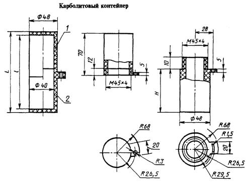 Черт. 12 Черт. 13 Черт. 14 3.10. Пломбирование продукции проводят на потребительской таре, за исключением запаянных ампул. 3.11. Баллоны, предназначенные для перевозки грузов, должны быть определенной окраски с нанесенными полосами и надписями разных цветов в соответствии с требованиями «Правил устройства и безопасной эксплуатации сосудов, работающих под давлением», утвержденных Госгортехнадзором СССР 10.05.70. 3.12. Потребительскую тару, за исключением баллонов, канистр, фляг и мешков, помещают в пенопластовый амортизатор или карболитовый контейнер с уплотняющим материалом (черт. 15), изготавливаемый по НТД, утвержденной в установленном порядке, затем в транспортную тару - ящики по ГОСТ 5959 из фанеры толщиной не менее 3 мм. 1 - крышка; 2 - контейнер Размеры, мм