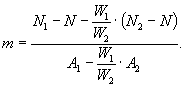 Для данной аппаратуры принимается допущение, что скорость счета (Nф.н), обусловленная фоном, пропорциональна мощности реактора. Чувствительность аппаратуры может быть определена только в случае изменения (Ni) и (Ai) при неизменном режиме работы реактора или изменения Ai, не пропорционального изменению мощности реактора. При этом условии определяют (N1) и (N2), а также путем спектрометрического анализа проб из коммуникаций реактора (A1) и (А2) при мощностях (W1) и (W2). Чувствительность (m) рассчитывают по формуле