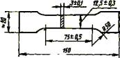 4.5.4. Прочность при статическом изгибе определяют по ГОСТ 255-75. 4.5.5. Хрупкость эбонита определяют по ГОСТ 258-75. 4.5.6.Сопротивление срезу определяют по ГОСТ 211-75. 4.5.7. Определение прочности при разрыве 4.5.7.1. Для проведения испытания применяют разрывную машину, обеспечивающую: приложение нагрузки не более 1,5 % от фактической величины; скорость движения подвижного зажима такую, чтобы прилагаемая сила достигла максимальной величины за (30 ±15) с. Форма и размеры образцов для испытаний указаны на чертеже. Поверхности и боковые стороны образца должны быть гладкими. Испытанию подвергают не менее трех образцов. При разрыве образцов за пределами узкой части, а также при явных дефектах испытания считают неудовлетворительными и проводят повторно. (Измененная редакция, Изм. № 3). 4.5.7.2. Прочность при разрыве (σ) в МПа. (кгс/см2) вычисляют по формуле: