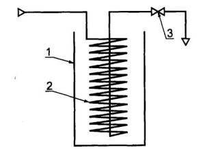 1 - сосуд для охлаждающей смеси; 2 - змеевик; 3 - игольчатый вентиль Черт. 1 3.2.2. Проведение испытаний 3.2.2.1. На штуцер пробоотборника с испытуемым газом навинчивают накидную гайку с чистой сухой отводной трубкой. Открывая нижний вентиль (у пробоотборника типа ПГО-400 - выпускной вентиль) вертикально расположенного пробоотборника, осторожно наливают сжиженный газ через трубку в чистый сухой отстойник. При наливе конец трубки удерживают под поверхностью заполняющей жидкости, отстойник наполняют до метки 100 см3. 3.2.2.2. Затем быстро устанавливают медную проволоку в пробку из ваты, неплотно вставленную в горло отстойника. Проволока предотвращает перегрев жидкости и ее вскипание с выбросом и способствует равномерному испарению сжиженного газа, а пробка из ваты не пропускает в отстойник влагу из воздуха. 3.2.2.3. После испарения основной массы при температуре окружающей среды и прекращения заметного испарения жидкости отстойник помещают в водяную баню с температурой (40±1) °С и выдерживают 20 мин при этой температуре. После этого фиксируют наличие остатка в отстойнике. 3.2.2.4. При проведении повторных и арбитражных испытаний отстойник заполняют сжиженным газом через охлаждающий змеевик. Змеевик устанавливают в сосуд для охлаждающей смеси, снабженный термометром, охлаждают до температуры на несколько градусов ниже температуры кипения основного компонента пробы и присоединяют к пробоотборнику или пробоотборной точке. 3.2.2.5. Открывая вентили на пробоотборнике или пробоотборной точке и змеевике, промывают змеевик сжиженным газом. Затем отстойник наполняют пробой сжиженного газа, выходящей из змеевика, до метки 100 см3, не допуская выброса пробы из отстойника. Повторяют операцию испарения газа по пп. 3.2.2.2 и 3.2.2.3. 3.2.2.6. Если в сжиженном газе имеется свободная вода, после испарения газа она остается на дне и стенках отстойника. При затруднениях в визуальной идентификации свободной воды в жидком остатке ее наличие определяют с помощью водорастворимого индикатора. Для этого в отстойник вносят на кончике сухой стеклянной палочки или проволоки несколько кристаллов тимолового синего. В углеродном жидком остатке тимоловый синий не растворяется и не окрашивается. Окрашивание жидкости при контакте с индикатором подтверждает наличие воды. В щелочной среде тимоловый синий окрашивается в синий цвет. Для определения наличия щелочи в жидком остатке допускается применять в качестве индикатора фенолфталеин. В отстойник добавляют 10 см3 дистиллированной воды, предварительно проверенной на нейтральность, и 2-3 капли фенолфталеина. Отсутствие окраски раствора в розовый или красный цвет фиксирует отсутствие щелочи, окраска раствора - присутствие щелочи». Пункт 3.4 - 3.4.3 исключить. (ИУС № 4 2000 г.)