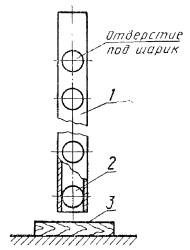 1 - направляющая труба; 2 - шарик; 3 - испытуемый образец шарик стальной диаметром 40 мм и массой (263±1) г по ГОСТ 3722; металлическую линейку со шкалой деления 1 мм. 3. ПОДГОТОВКА К ИСПЫТАНИЮ3.1. Зажимное устройство размещают на горизонтальной ровной и неподвижной поверхности. Испытуемый образец устанавливают в зажимное устройство и закрепляют его. Если испытания проводят на готовых деталях (изделиях), то деталь располагают на горизонтальной ровной и неподвижной поверхности, не используя зажимное устройство, предварительно отмечают места удара шарика. 3.2. Подготавливают к работе приспособления для испытания. Направляющая труба должна быть неподвижно закреплена в вертикальном положении и расположена над испытуемым образцом так, чтобы свободно падающий шарик попадал на предусмотренное для удара место. 4. ПРОВЕДЕНИЕ ИСПЫТАНИЯ4.1. Стальной шарик при первом испытании должен падать на поверхность образца с высоты 250 мм. Если при первом испытании не появились трещины или отслаивание покрытий, то испытание продолжают, постепенно увеличивая высоту падения шарика в соответствии с рядом значений 250, 375, 500, 750, 1000, 1250, 1500, 1750, 2000 мм. Для каждой высоты падения проводят три испытания. Допускается начинать проведение испытания с минимальной высоты более 250 мм, выбираемой из приведенного ряда значений. Увеличение высоты падения шарика прекращают, если получают повреждение испытуемого покрытия в одном из трех испытаний. 4.2. Расстояние точек падения от центра поверхности испытуемого образца должно составлять не более 50 мм, а расстояние между точками падения и от края образца - не менее 20 мм. 4.3. Осмотр внешнего вида покрытия проводят визуально после каждого испытания, без применения увеличительных приборов, на расстоянии 250-300 мм от точки падения под углом 30-60° при дневном или искусственном рассеянном свете. Освещенность должна быть не менее 1000 лк. 4.4. Испытания проводят при T = (23±2) °С. 5. ОБРАБОТКА РЕЗУЛЬТАТОВ5.1. Показателем ударной прочности является максимальная высота (мм), при падении шарика с которой не происходит повреждения покрытия в трех испытаниях на каждом из испытуемых образцов. Результаты испытаний заносят в протокол (см. приложение). 5.2. Оценку результатов испытаний производят по пятибалльной системе: 1 балл - нет видимых повреждений; 2 балла - на поверхности покрытия нет трещин, но след от удара виден в отраженном свете; 3 балла - наблюдается небольшое растрескивание поверхности (одна или две трещины); 4 балла - наблюдаются трещины (более двух в пределах следа от удара); 5 баллов - наблюдаются трещины, выходящие за границы следа от удара и (или) отслаивание покрытия. ПРИЛОЖЕНИЕ