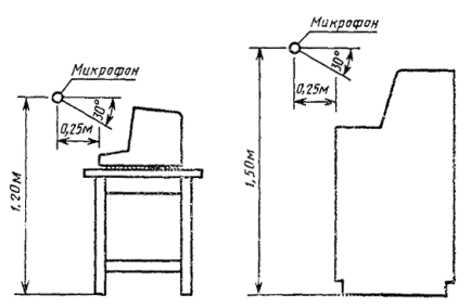 * Значение эквивалентного уровня звука А, указанное в скобках, действует до 01.01.88. Примечания: 1. Значения установлены для 8-часовой рабочей смены. 2. Приведенные в табл. 1 допустимые значения LAeq могут быть достигнуты при помощи мероприятий, указанных в приложении 2. 2. МЕТОДЫ ОПРЕДЕЛЕНИЯ2.1. Общие положения 2.1.1. Измерения следует проводить по СТ СЭВ 541-77 и ГОСТ 12.1.003-83. 2.1.2. Аппаратура Для измерений использовать интегрирующие шумомеры. Допускается использовать шумомеры, измеряющие мгновенное значение, или классифицирующие устройства уровня звукового давления. Следует применять аппаратуру класса точности 0; 1 или 2 по ГОСТ 17187-81. Измерительную систему перед началом измерений подвергают калибровке, а после проведения измерений - контролю. При этом предпочтение следует отдавать источнику звука, уровень звукового давления которого известен с погрешностью, не выходящей за пределы ± 0,5 дБ. Если разница значений уровней звука, измеренных при калибровке и контроле, превышает 1 дБ, то результаты измерений считают недействительными. Для измерительных приборов и источников звука должно быть действующее свидетельство о поверке. 2.1.3. Точки измерения Точки измерения - по ГОСТ 12.1.003-83. Рекомендуемая установка микрофона при испытаниях представлена на черт. 1. Расположение микрофона в зависимости от положения оператора на рабочем месте 1) Оператор в положении сидя 2) Оператор в положении стоя 2.1.4. Режим работы во время измерений Рабочее состояние, загрузка и установка устройств должны соответствовать нормальным условиям эксплуатации. Во время испытаний устройства эксплуатируют согласно режиму работы, указанному изготовителем в эксплуатационной документации. Режим работы устройств во время проверок должен позволять проводить регистрацию максимального шума, излучаемого этими устройствами при нормальных условиях работы. Измерения проводят по истечении времени готовности. При этом устройства должны работать преимущественно в автоматическом режиме. 2.2. Определение эквивалентного уровня звука А 2.2.1. Непостоянный шум Общее время измерения должно быть не менее 15 мин и выбираться так, чтобы результаты измерений характеризовали влияние шума во время 8-часовой рабочей смены. Если интегрирующий шумомер не используют, то для определения эквивалентного уровня звука А необходимо применить требования СТ СЭВ 541-77. 2.2.2. Постоянный шум При постоянном шуме