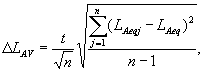 где DLAV - случайная ошибка в соответствии с пп. 2.2.3.1 и 2.2.3.2; DLAsyst - систематическая ошибка измерительных приборов; для измерительных приборов класса точности 0 DLAsyst = 1 дБ, для измерительных приборов классов точности 1 и 2 - DLAsyst - 2 дБ. 2.2.3.1. Случайная ошибка DLAV при непостоянном шуме. Измерения проводят не менее 3 раз. Случайную ошибку вычисляют по формуле