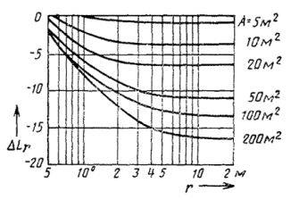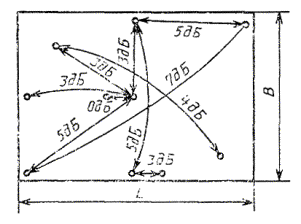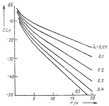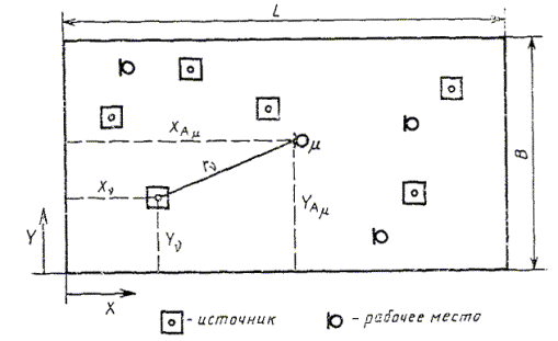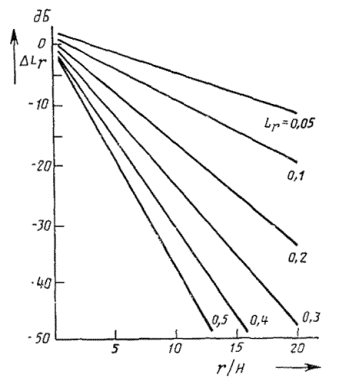 Общий случай распределения источников шума и рабочих мест в помещении где LWA - корректированный уровень звуковой мощности A, дБ, относящегося к этому источнику шума; DLRQ - поправка, дБ, учитывающая тип помещения; DLr - поправка, дБ, учитывающая расстояние и поглощение звука; DLR - поправка, дБ, учитывающая отражение звука от стен. Поправки определяют по табл. 5. Примечание. Формулу (9) применяют для случаев: r > 0,75 Lmax (кубическое помещение); r > 0,5 H (помещение с низким потолком); r