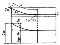 Черт. 1. Схема изменения напряжений в арматуре при наличии трения арматуры о стенки каналов, о поверхность бетона или об огибающие приспособления 1 - натяжное устройство; 2 - анкер; s4 - потери напряжения от трения Таблица 5 (6)