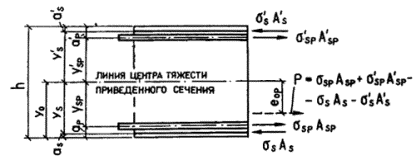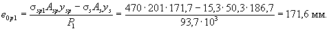 Потери от быстронатекающей ползучести s6 равны: на уровне арматуры S: a = 0,25 + 0,025Rbp = 0,25 + 0,025×17,5 = 0,69 < 0,8; поскольку sbp/Rbp = 13,3/17,5 = 0,77 > a = 0,69, то s6 = 34a + 72b(sbp/Rbp - α) = 34×0,69 + 72×2,01(0,77 - 0,69) = 35,0 МПа, где b = 5,25 - 0,185Rbp = 5,25 - 0,185×17,5 = 2,01 < 2,5, но более 1,1; на уровне арматуры S¢: s¢6 = 34s'bp/Rbp = 34·2,1/17,5 = 4,1 МПа. Напряжение ssp1 с учетом первых потерь равно: для арматуры S ssp1 = (ssp - s1 - s2 - s3) - s6 = 980 - 35 = 945 МПа; для арматуры S¢ s¢sp1 = 980 - 4,1 = 976 МПа. Определим усилие обжатия с учетом первых потерь P1 и его эксцентриситет e0p1 по формулам (8) и (9): P1 = ssp1Asp + s¢sp1A¢sp = 945×1699 + 976×283 = 1882 кН;