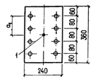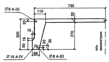 где sbki(j) - напряжения в бетоне в среднем сечении j-го участка; lj - длина j-го участка; l - длина элемента в пределах рассматриваемого пучка (каната). При прямолинейных и параллельных к продольной оси элемента пучках (канатах) и постоянном поперечном сечении элемента значение Ssbki определяют по формуле (10), вычисляя P (и соответствующее значение e0) от всей арматуры, натягиваемой после рассматриваемой группы k. Примеры расчетаПример 1. Дано: плита покрытия размером 1,5´6 м; поперечное сечение - по черт. 3; бетон тяжелый класса В25 (Eb = 2,7×104 МПа); передаточная прочность бетона Rbp = 17,5 МПа; напрягаемая арматура класса А-IV (Rs,ser = 590 МПа, Es = 19×104 МПа) площадью сечения Asp = 201 мм2 (1 Æ 16), ненапрягаемая арматура сжатая и растянутая класса А-III (Es = 2×104 МПа) площадью сечения As = A¢s = 50,3 мм2 (1 Æ 8); натяжение арматуры производится на упоры формы электротермическим неавтоматизированным способом; технология изготовления плиты - агрегатно-поточная с применением пропаривания; масса плиты 1,3 т. Требуется определить значение и точку приложения усилия предварительного обжатия P1 (с учетом первых потерь) и P2 (с учетом всех потерь) для сечения в середине пролета, принимая максимально допустимое натяжение арматуры. Черт. 3. К примеру расчета 1 Расчет. Ввиду симметрии сечения расчет ведем для половины сечения плиты. Определяем геометрические характеристики приведенного сечения согласно п. 1.21, принимая: коэффициент a для всей арматуры.