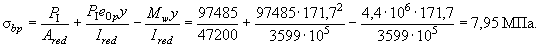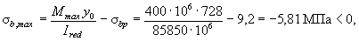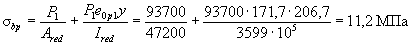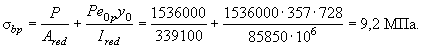 В соответствии с п. 1.22 проверим максимальное сжимающее напряжение бетона sbp от действия силы Р1, вычисляя его по формуле (10) при y = y0 = 206,7 мм: