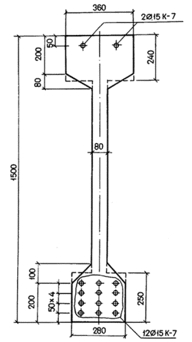 Пример 2. Дано: свободно опертая балка с поперечным сечением по черт. 4; бетон тяжелый класса В35 (Eb = 3,1×104 МПа); передаточная прочность бетона Rbp = 17,5 МПа; напрягаемая арматура из канатов класса К-7 (Rs,ser = 1295 МПа, Es = 18×104 МПа) площадью сечения: в растянутой зоне Asp = 1699 мм2 (12 Æ 15), в сжатой зоне A¢sp = 283 мм2 (2 Æ 15); натяжение производится на упоры стенда механическим способом; бетон подвергается пропариванию; закрепление канатов на упорах с помощью инвентарных зажимов; длина стенда 20 м; масса балки 11,2 т; длина балки l = 18 м. Требуется определить величину и точку приложения усилия предварительного обжатия с учетом первых потерь напряжения P1 и с учетом всех потерь P2 для сечения в середине пролета, принимая максимально допустимое натяжение арматуры. Черт. 4. К примеру расчета 2 Расчет. Определяем геометрические характеристики приведенного сечения согласно п. 1.21, принимая коэффициент a = Es/Eb = 18·104/3,1·104 = 5,8 (площадь сечения конструктивной ненапрягаемой арматуры не учитывается ввиду ее малости). Для упрощения расчета высоту свесов полок усредняем. Площадь приведенного сечения Ared = A + aAsp + aA'sp = 1500×80 + 280×240 + 200×250 + 5,8(1699 + 283) = 24,9×104 мм2 Расстояние от центра тяжести сечения арматуры S до нижней грани балки (учитывая, что сечения всех четырех рядов арматуры одинаковой площади)