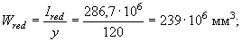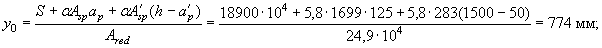 Статический момент сечения бетона относительно нижней грани балки S = 80·15002/2 + 280·240(1500 - 120) + 200·2502/2 = 18900×104 мм3. Расстояние от центра тяжести сечения до нижней грани: