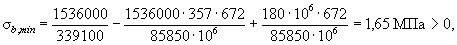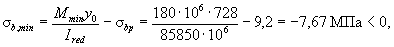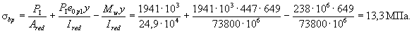 Вследствие того, что при минимальной внешней нагрузке напряжения в бетоне по нижней грани сжимающие, напряжения в верхнем волокне бетона при этой нагрузке будем определять по полному приведенному сечению, т.е. при Ared = 339100 мм2; Ired = 85850·106 мм4; e0p = 357 мм; y' = 1400 - 728 = 672 мм: