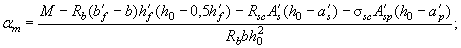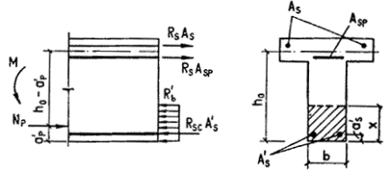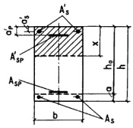 где xR - см. п. 3.6, а также примечание к п. 3.11. Если принятая площадь сечения сжатой арматуры A's значительно превышает ее требуемое значение из формулы (32), то площадь сечения напрягаемой арматуры растянутой зоны определяется с учетом фактического значения A's. В любом случае при наличии учитываемой в расчете арматуры S' требуемая площадь сечения напрягаемой арматуры растянутой зоны определяется по формуле где x - определяется по табл. 28 в зависимости от значения gs6 - см. п. 3.7, при этом должно выполняться условие x < xR (см. табл. 26 и 27). Если am < 0, значение Asp определяется по формуле