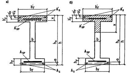 где h - см. п. 3.7. ТАВРОВЫЕ И ДВУТАВРОВЫЕ СЕЧЕНИЯ3.13 (3.16). Расчет сечений, имеющих полку в сжатой зоне (тавровых, двутавровых и т.п.) и арматуру, сосредоточенную у растянутой и у сжатой граней элемента (черт. 6), производится в зависимости от положения границы сжатой зоны: а) если граница сжатой зоны проходит в полке (черт. 6, а), т.е. соблюдается условие gs6RsAsp + RsAs £ Rbb¢fh¢f + RscA¢s + sscA¢sp, (37) где gs6 определяется по формуле (23) при x = h¢f/h0, расчет производится как для прямоугольного сечения шириной b'f в соответствии с указаниями п. 3.9; Черт. 6. Форма сжатой зоны в двутавровом поперечном сечении железобетонного элемента а - при расположении границы сжатой зоны в полке; б - то же, в ребре б) если граница сжатой зоны проходит в ребре (черт. 6, б), т.е. условие (37) не соблюдается, то расчет производится следующим образом в зависимости от относительной высоты сжатой зоны x1: при x1 £ xR - из условия M £ Rbbx(h0 - 0,5x) + Rb(b¢f - b)h¢f(h0 - 0,5h¢f) + RscA¢s(h0 - a¢s) + sscA¢sp(h0 - a¢p), (39) где Здесь gs6 определяется по формуле где h - см. п. 3.7; при x1 > xR - из условия M £ ((am + aR)/2)Rbbh02 + Rb(b¢f - b)h¢f(h0 - 0,5h¢f) + RscA¢s(h0 - a¢s) + sscA¢sp(h0 - a¢p); (42) при напрягаемой арматуре растянутой зоны классов А-IIIв и А-III значение (am + aR)/2 в условии (42) заменяется на aR; aR и am - см. п. 3.9 или табл. 28. При большом количестве в растянутой зоне ненапрягаемой арматуры с физическим пределом текучести (когда RsAs > 0,2RsAsp) следует учитывать указания п. 3.9. Примечания: 1. При переменной высоте свесов полки допускается принимать значение h¢f равным средней высоте свесов. 2. Ширина сжатой полки b'f, вводимая в расчет, не должна превышать значений, указанных в п. 3.16. 3.14. Требуемая площадь сечения сжатой ненапрягаемой арматуры определяется по формуле