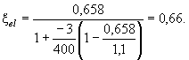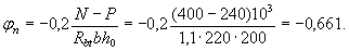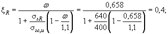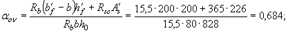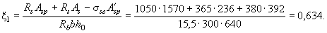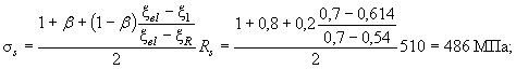 Поскольку натяжение арматуры электротермическое неавтоматизированное, принимаем, согласно п. 3.6, Dssp = 0. Из табл. 26 и 31 при gb2 = 0,9, классе арматуры А-IV, классе бетона В25 и при (ssp + Dssp)/Rs = 306/510 = 0,6 находим xR = 0,54 и xel = 0,7. Поскольку выполняется условие (55): x1 = 0,614 > xR = 0,54, расчет повторяем, заменяя в формуле (49) значение Rs на напряжение ss, определенное по формуле (56). Согласно п. 3.18, b = 0,8;