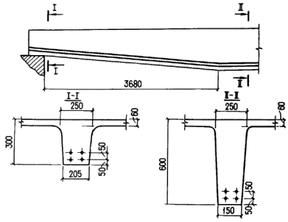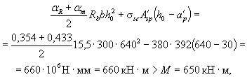 где aR - определяется по формуле aR = xR(1 - 0,5xR); xR - см. п. 3.6. При этом, если xR £ h'f/h0, значение A's определяется как для прямоугольных сечений шириной b = b'f согласно п. 3.12. а) если граница сжатой зоны проходит в полке, т.е. соблюдается условие M £ Rbb'fh'f(h0 - 0,5h'f) + RscA¢s(h0 - a's) + sscA¢sp(h0 - a'p), (44) площадь сечения растянутой арматуры определяется как для прямоугольного сечения шириной b¢f в соответствии с указаниями пп. 3.11 и 3.12; б) если граница сжатой зоны проходит в ребре, т.е. условие (44) не соблюдается, площадь сечения растянутой напрягаемой арматуры определяется по формуле где x - определяется по табл. 28 в зависимости от значения gs6 - см. п. 3.7. При этом должно соблюдаться условие x £ xR, где xR - см. п. 3.6 и табл. 26 и 27, а также примечание к п. 3.11. 3.16 (3.16). Вводимая в расчет ширина сжатой полки b¢f принимается из условия, что ширина свеса в каждую сторону от ребра должна быть не более 1/6 пролета элемента и не более: а) при наличии поперечных ребер или при h¢f ³ 0,1h - 1/2 расстояния в свету между продольными ребрами; б) при отсутствии поперечных ребер или при расстояниях между ними бóльших, чем расстояния между продольными ребрами, и h'f < 0,1h - 6h'f; в) при консольных свесах полки: при h¢f ³ 0,1h 6h¢f " 0,05h £ h¢f < 0,1h 3h¢f " h'f < 0,05h свесы не учитываются Примеры расчетаПрямоугольные сечения Пример 3. Дано: размеры сечения - b = 300 мм, h = 700 мм; а = 50 мм; нагрузки непродолжительного действия отсутствуют; бетон тяжелый класса В25 (Rb = 13 МПа при gb2 = 0,9); напрягаемая арматура класса А-IV (Rs = 510 МПа), площадью сечения Asр = 1847 мм2 (3 Æ 28); предварительное напряжение при gsp < 1: без учета потерь ssp1 = 500 МПа, с учетом всех потерь ssp2 = 400 МПа; ненапрягаемая арматура класса А-III (Rs = 365 МПа), площадью сечения As = 236 мм2 (3 Æ 10); изгибающий момент M = 580 кН×м; натяжение арматуры электротермическое автоматизированное. Требуется проверить прочность сечения. Расчет. h0 = 700 - 50 = 650 мм. По формуле (24) определим значение x1: