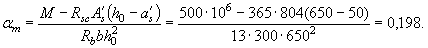 т.е. прочность сечения обеспечена. Пример 5. Дано: размеры сечения - b = 300 мм, h = 700 мм, а = a¢s = 50 мм; бетон тяжелый класса В25 (Rb = 13 МПа при gb2 = 0,9); напрягаемая арматура S класса А-IV (Rs = 510 МПа); ненапрягаемая арматура S класса А-III (Rsc = 365 МПа), площадью сечения A¢s = 804 мм2 (1 Æ 32); изгибающий момент M = 500 кН×м. Требуется определить площадь сечения продольной напрягаемой арматуры. Расчет. h0 = 700 - 50 = 650 мм. Площадь сечения продольной напрягаемой арматуры, расположенной в растянутой зоне, определяем согласно п. 3.12. По формуле (35) вычисляем значение am: