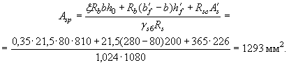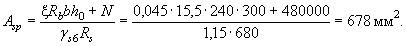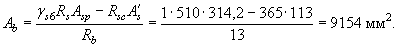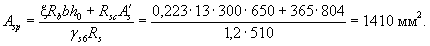 Из табл. 28 по значению am = 0,198 находим x = 0,223. Из табл. 26 при gb2 = 0,9, классе арматуры А-IV, классе бетона В25, принимая, согласно примеч. 1, (ssp + Dssp)/Rs = 0,6, находим значение xR = 0,54. Поскольку x = 0,223 < xR = 0,54, то площадь сечения арматуры определяем по формуле (34). Так как x = 0,223 < 0,5xR = 0,5×0,54 = 0,27, то, согласно п. 3.7, gs6 = h = 1,2. Отсюда