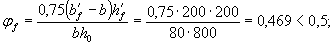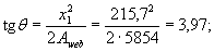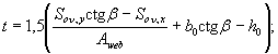 Площадь сечения наиболее сжатого свеса и ее статические моменты относительно осей x и y соответственно равны: Aоn = b'onh'f = 55×60 = 3300 мм2; Son,y = Aоn(b0 + 0,5b'on) = 3300(55 + 0,5×55) = 272000 мм3; Son,x = Aоn(h0 - 0,5h'f) = 3300(270 - 0,5×60) = 792000 мм3 Так как Ab > Aon, далее расчет производим как для таврового сечения: Aweb = Ab - Aon = 9154 - 3300 = 5854 мм2. Определяем размер сжатой зоны x1 по формуле (50), принимая ctgb = 4: