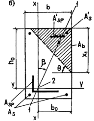 Принимаем 10 Æ 15 (Asp = 1416 мм2). ЭЛЕМЕНТЫ, РАБОТАЮЩИЕ НА КОСОЙ ИЗГИБ3.17. Расчет прямоугольных, тавровых, двутавровых и Г-образных сечений элементов, работающих на косой изгиб, допускается производить, принимая форму сжатой зоны по черт. 7; при этом должно удовлетворяться условие Mx £ Rb[Son,x + Aweb(h0 - x1/3)] + RscSsx + sscSspx, (47) где Mx - составляющая изгибающего момента в плоскости оси x (за оси x и y принимаются две взаимно перпендикулярные оси, проходящие через точку приложения равнодействующей усилий в растянутой арматуре, параллельно сторонам сечения; для сечения с полкой ось x принимается параллельно плоскости ребра); Aweb = Ab - Aon; (48) Ab - площадь сжатой зоны бетона, равная: Aon - площадь сечения наиболее сжатого свеса полки; x1 - размер сжатой зоны бетона по наиболее сжатой стороне сечения, определяемый по формуле здесь Son,x - статический момент площади Аon в плоскости оси x относительно оси y; Son,y - то же, в плоскости оси y относительно оси x; b0 - расстояние от равнодействующей усилий в растянутой арматуре до наиболее сжатой боковой стороны сечения (грани ребра); b - угол наклона плоскости действия изгибающего момента к оси x, т.е. ctgb = Mx/My; Ssx, Sspx - статические моменты площади сечения соответственно ненапрягаемой и напрягаемой арматуры S' относительно оси y. Черт. 7. Форма сжатой зоны в поперечном сечении железобетонного элемента, работающего на косой изгиб а - таврового сечения; б - прямоугольного сечения; 1-1 - плоскость действия изгибающего момента; 2 - точка приложения равнодействующей усилий в растянутой арматуре При расчете прямоугольных сечений значения Aon, Son,x и Son,y в формулах (47), (48) и (51) принимаются равными нулю. Если Ab < Aon или если x < 0,2h¢f, расчет производится как для прямоугольного сечения шириной b = b¢f. Если выполняется условие где bon - ширина наименее сжатого свеса полки, расчет производится без учета косого изгиба, т.е. по формулам пп. 3.9 и 3.13 на действие момента M = Mx; при этом следует проверить условие (55), принимая х1, как при косом изгибе. Приведенную методику расчета следует применять, если относительная высота сжатой зоны, измеренная по нормали к границе сжатой зоны и определяемая по формуле (53), меньше или равна xR (см. п. 3.6): где b¢on - ширина наиболее сжатого свеса; q - угол наклона прямой, ограничивающей сжатую зону, к оси y, значение tgq определяется по формуле tgq = x12/(2Aweb); (54) x1 - для определения x1 вычисляется по формуле (50) при gs6 = 1,0. Для проверки условия (47) коэффициент gs6 в формуле (49) определяется, согласно п. 3.7, при значении x, принимаемом равным: при отсутствии в сжатой зоне полки x = x1; при наличии в сжатой зоне полки x = (x1 + xR)/2. Если выполняется условие x1 > xR, (55) следует произвести повторный расчет с заменой для напрягаемой арматуры в формуле (49) значения gs6Rs напряжением ss, равным: для арматуры с условным пределом текучести (см. п. 2.16): при x £ xel (где xel - см. п. 3.18 или табл. 31) при x > xel где b - см. п. 3.18; ssc,u, w, ssp - см. п. 3.6;