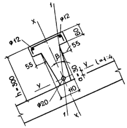 значение w, а также выражение для арматуры с физическим пределом текучести - по формуле (57). При этом ненапрягаемую арматуру с физическим пределом текучести, если площадь ее сечения не превышает 0,2Asp, допускается учитывать в формуле (49) с полным расчетным сопротивлением. При большей площади указанной ненапрягаемой арматуры, если x > xR (где xR определено для этой арматуры), в формуле (49) значение Rs для ненапрягаемой арматуры заменяется на напряжение ss, определяемое по формуле (57). Если выполняются условия (58) и (59), то расчет на косой изгиб производится по формулам общего случая расчета нормального сечения согласно п. 3.18: для прямоугольных и тавровых сечений с полкой в сжатой зоне x1 > h; (58) для двутавровых и тавровых сечений с полкой в растянутой зоне x1 > h - hf - bon,ttgq, (59) где hf, bon,t - высота и ширина наименее растянутого свеса полки (черт. 8). Черт. 8. Двутавровое сечение со сжатой зоной, заходящей в наименее растянутый свес полки 1-1 - плоскость действия изгибающего момента При использовании формул настоящего пункта за растянутую арматуру площадью Asp и As рекомендуется принимать арматуру, располагаемую вблизи растянутой грани, параллельной оси y, а за сжатую арматуру площадью A'sp и A's - арматуру, располагаемую вблизи сжатой грани, параллельной оси y, но по одну наиболее сжатую сторону от оси x (см. черт. 7). Если арматура распределена по сечению, что не позволяет до расчета определить площади и центры тяжести сечений арматуры S и S', расчет также производится по формулам общего случая согласно п. 3.18. При наличии ненапрягаемой арматуры с условным пределом текучести учитывается примечание к п. 3.3. Примеры расчетаПример 9. Дано: железобетонный прогон кровли с уклоном 1:4; размеры сечения по черт. 9; класс бетона В25 (Rb = 13 МПа при gb2 = 0,9); арматура S класса А-IV (Rs = 510 МПа) площадью сечению Asp = 314,2 мм2 (1 Æ 20); арматура S' класса А-III (Rsc = 365 МПа) площадью сечения A's = 226 мм2 (2 Æ 12); предварительное напряжение арматуры при gsp < 1 с учетом всех потерь ssp = 306 МПа; натяжение арматуры - электротермическое. Требуется определить предельный изгибающий момент в вертикальной плоскости. Расчет ведем без учета стержня, расположенного в наименее сжатом свесе. Из черт. 9 имеем: h0 = h - а = 300 - 30 = 270 мм; b0 = 110/2 = 55 мм; bon = b¢on = 55 мм; h¢f = 60 мм. Черт. 9. К примеру расчета 9 1-1 - плоскость действия изгибающего момента Определяем площадь сжатой зоны бетона по формуле (49), учитывая один стержень арматуры S', т.е. A¢s = 113 мм2 (1 Æ 12), и принимая gs6 = 1: