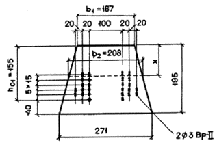 т.е. значение x = 76 мм принято правильно. Определим статический момент сжатой зоны бетона в виде трапеции относительно нижнего ряда проволок Sb. Ширина сечения по границе сжатой зоны равна: b2 = 167 + 2×0,267×76 = 208 мм; b1 = 167 мм. Тогда